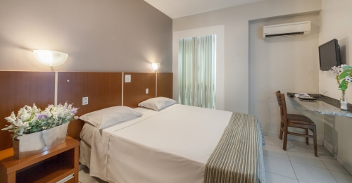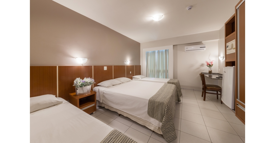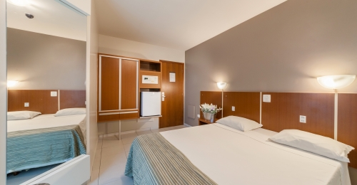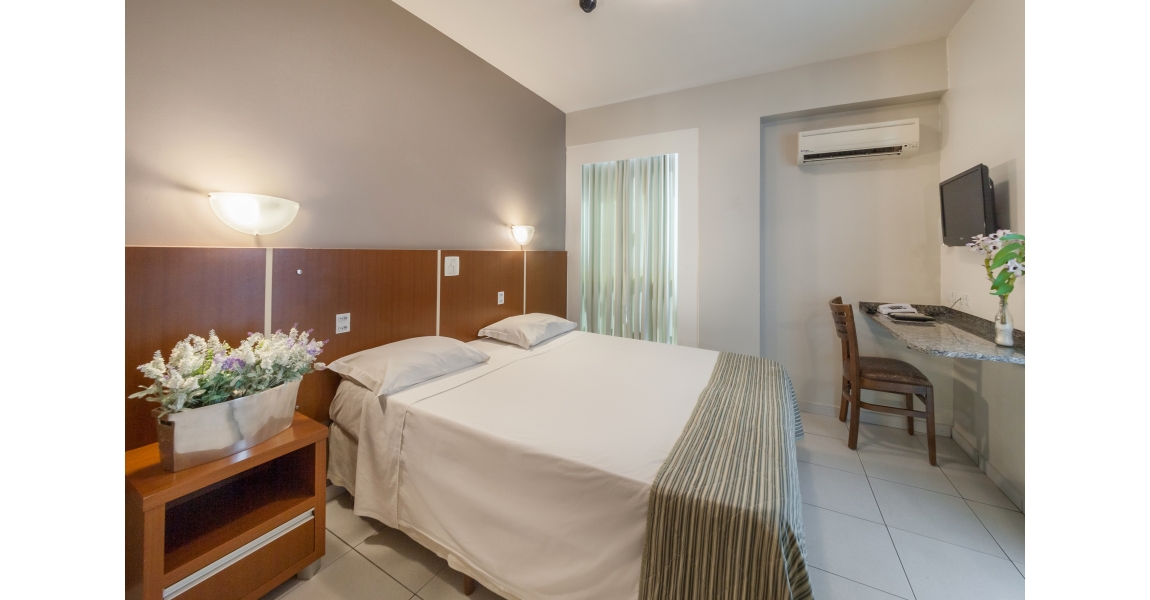 Apartamentos completos com Ar Condicionado, TV tela 32”, Internet Wireless, Cofre Digital, Telefone, TV à Cabo, Cama Box e Frigobar.