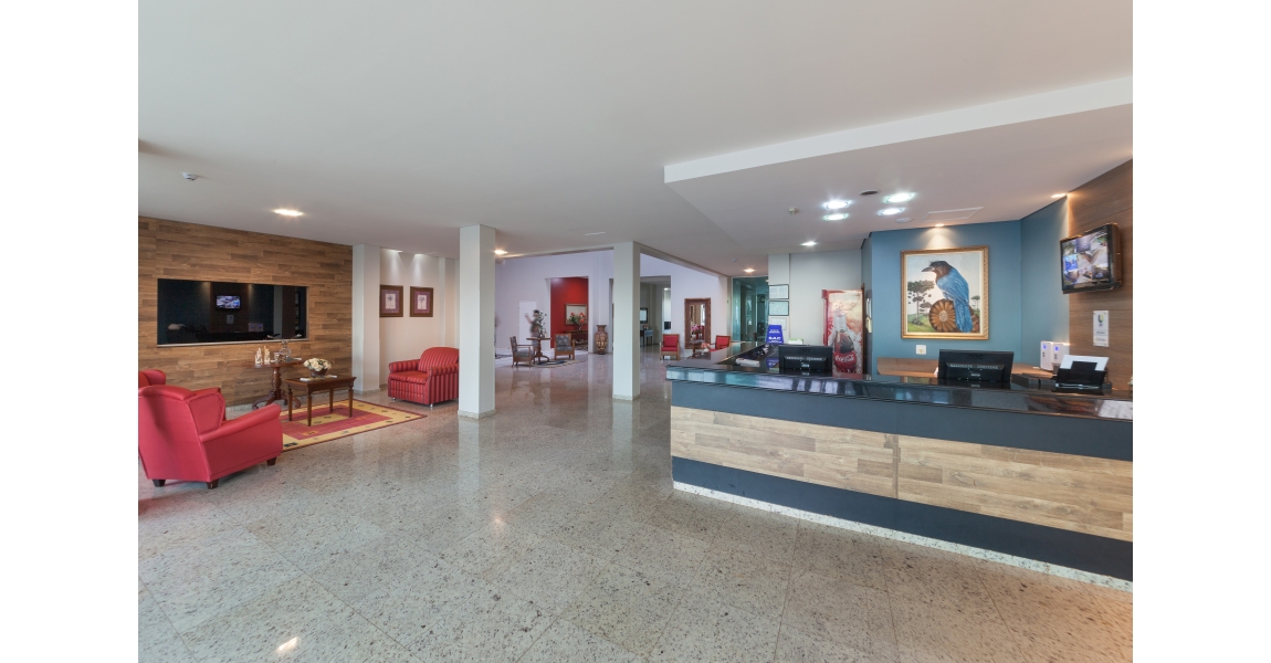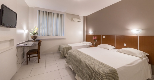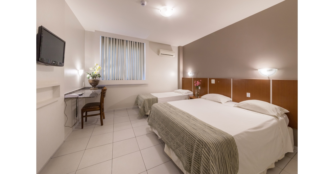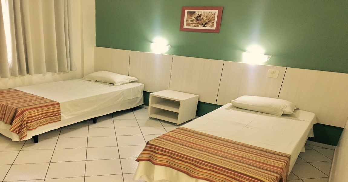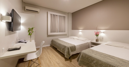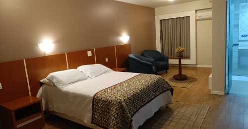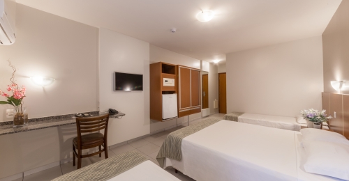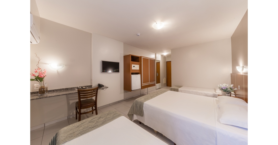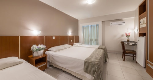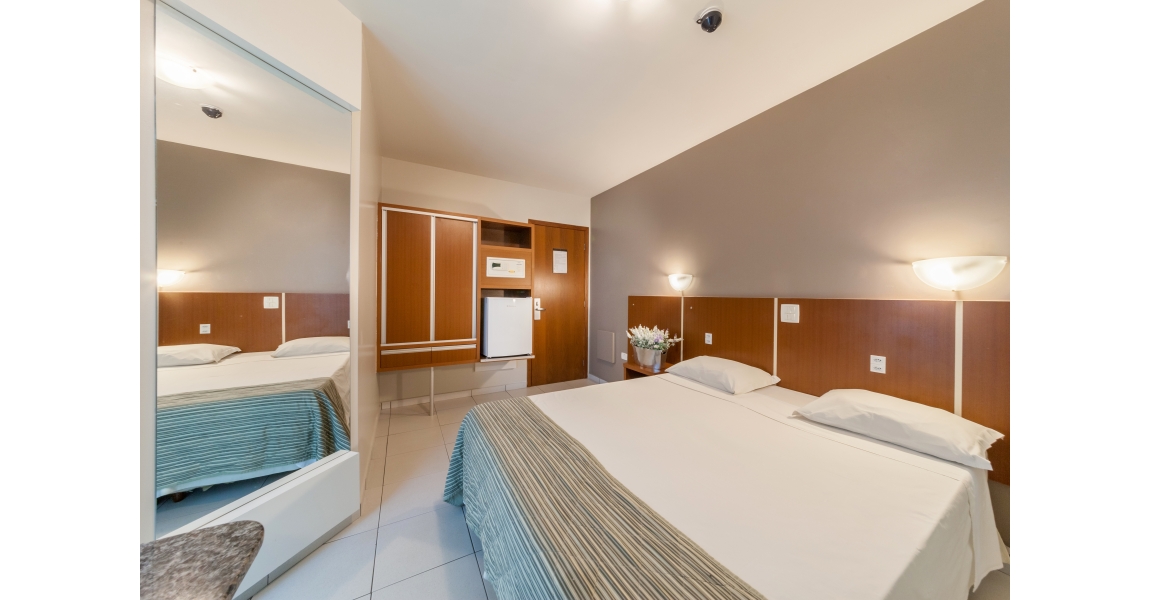 suíte completos com Ar Condicionado, TV tela 42”, Internet Wireless, Cofre Digital, Telefone, TV à Cabo, Cama Box e Frigobar desabastecido