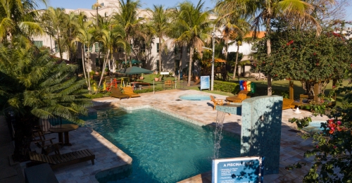 O hotel dispõe de duas piscinas, - adulta -5,00X10,00X1,20 e jacuzi ao ar livre para seis pessoas.